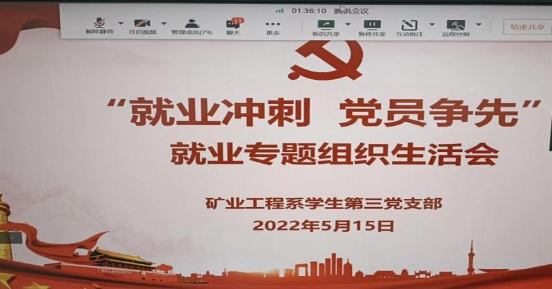 就业是民生之本,做好毕业生就业工作,是促进经济发展和社会和谐稳定的重要举措。为深入贯彻党中央、国务院“稳就业”“保就业”的决策部署,落实全国普通高等学校毕业生就业创业工作电视电话会议及学校就业工作会议精神,抢抓毕业生毕业前就业的关键期、冲刺期,矿业工程系学生第三党支部于2022年5月15日召开了“就业冲刺 党员争先”就业专题组织生活会。矿业工程系党总支书记薛淑萍、系主任宋宏志、党总支副书记李辉、分团委书记曹莉荣、18级机械设计制造及其自动化专业班主任郭辉参加了此次会议。