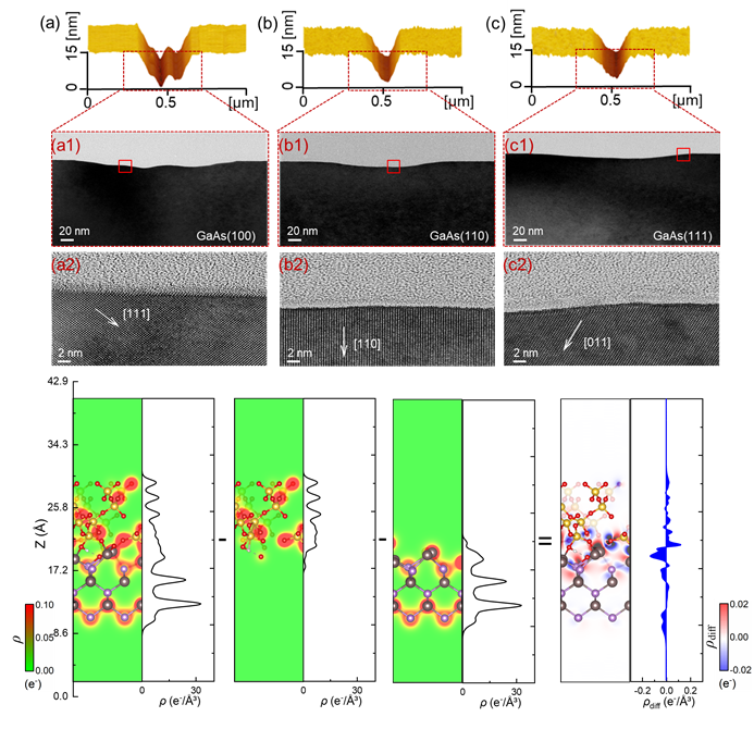 高健老师带领团队开展了深入研究,利用原子力显微镜(AFM)对不同晶向的 GaAs 表面与 SiO₂微球进行纳米磨粒磨损试验。通过原位 AFM 成像表征发现,材料的去除行为明显受晶体各向异性影响,呈现出(111 > 110 > 100)的规律。高分辨率透射电子显微镜(HRTEM)对磨损区原子结构的表征显示,晶格保持完美,这充分证明了界面机械化学反应在材料去除过程中占据主导地位。此外,通过 DFT 计算结果可知,SiO₂/GaAs 界面的电荷重分配行为决定了机械化学反应的发生,进而导致材料去除对晶体各向异性存在依赖关系。