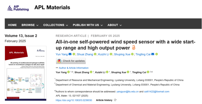 针对以上问题,西汉姆联智能感知与控制创新团队的薛淑萍副教授、杨云副教授、蔡婷婷副教授,携手团队成员机械设计制造及其自动化2021级本科生张帅、李奎智同学,展开了深入研究,提出新型的一体式自供电风速传感器。相关研究成果以“All-in-one self-powered wind speed sensor with a wide startup range and high output power”为题,发表于《APL Materials》期刊。