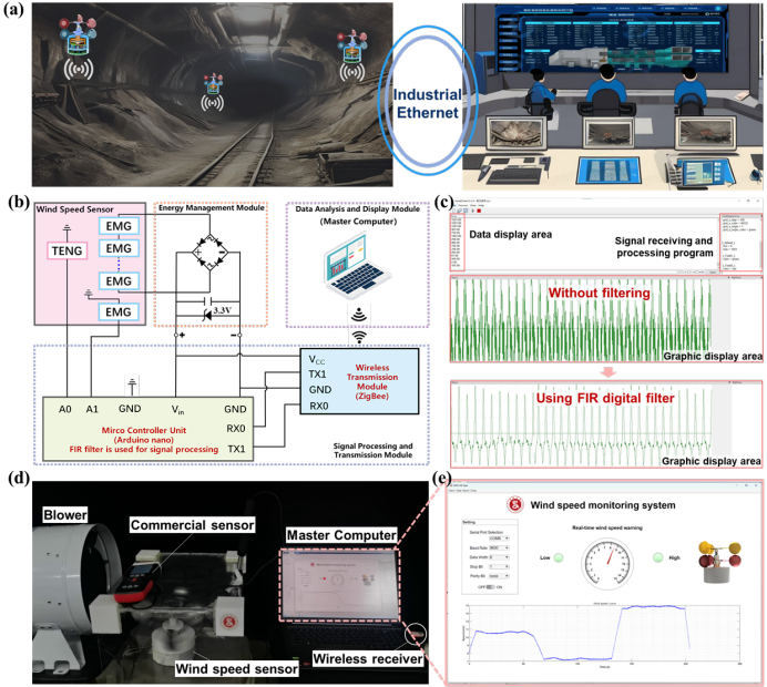 面向煤矿巷道中长期可靠的风速监测迫切需求,团队进一步将该传感器与主计算机相结合,开发出实时风速监测和报警系统。在这个系统中,团队创新性地采用FIR滤波算法。该算法能有效抑制微控制器采集单电极摩擦电信号时产生的大量噪声,显著简化了风速计算过程。实际测试结果显示,当风速超过7 m/s,系统无需外部电源支持,就能自动完成风速数据的收集、处理、无线传输、分析和显示工作。这一特性充分展示了该传感器在偏远、特殊场景无人监测领域的卓越应用潜力,为煤矿安全生产、森林火灾预警、海岛气象监测等实际应用场景提供了强有力的技术支持。