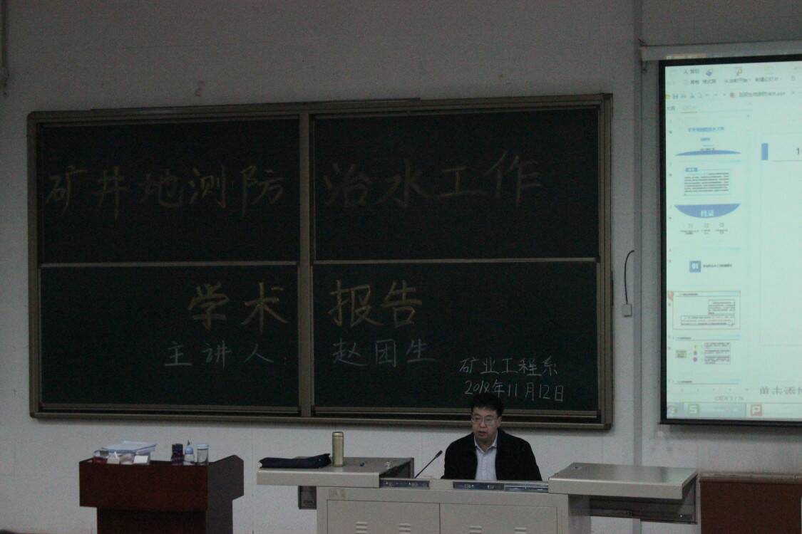 20181112日下午4:30,由矿业系组织的关于矿井地测防水工作的学术讲座2c—201展开。本次报告由西山煤电集团公司官地矿地测总工程师赵团生讲解。