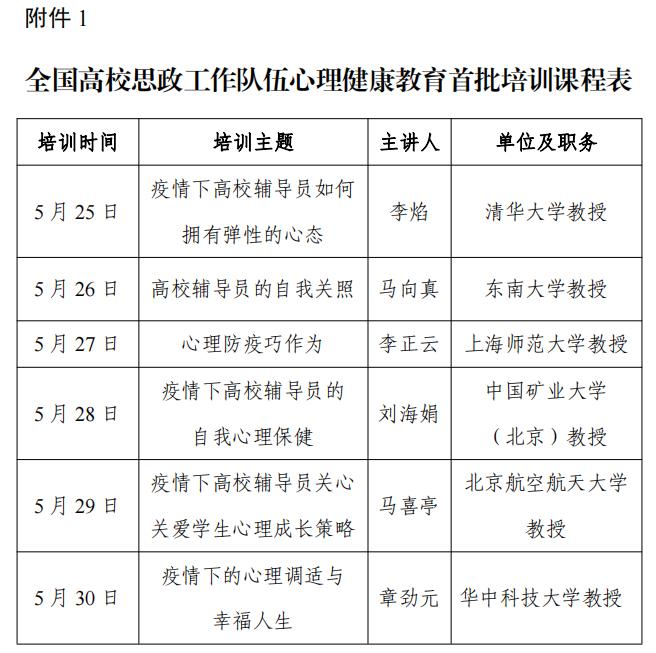 为进一步加强现阶段高校学生心理健康教育工作的针 对性和有效性,及时准确掌握疫情防控期间学生心理诉求,分类分阶段做好关怀帮扶,引导学生形成奋发向上的意志品质和积极乐观的阳光心态,切实加强对思政工作队伍的能力提升和关心关怀,根据上级文件精神,特组织我校辅导员参加本次培训,具体安排如下: