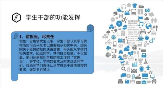 5月8日下午19:30,由曹莉荣老师在线上给同学们讲授《团学组织的基本职能和学生干部的功能发挥》,教导学生干部应起到模范引领作用,修身立己,奋发进取,勇于担当。