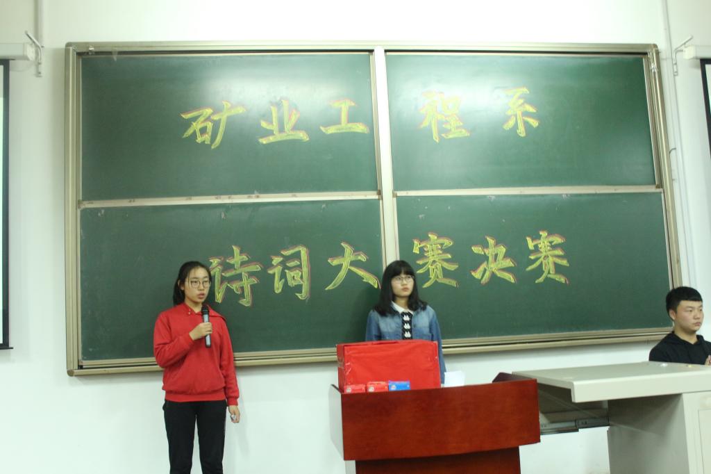 2017年11月12日19:30-21:30,矿业工程系诗词大赛决赛于1C-102举行。矿业工程系分团委、学生分会全体成员到场观看本次比赛。 本次诗词大赛决赛以古诗文竞答形式开展。比赛过程紧张而激烈。经过狭路相逢勇者胜、能力与机遇并存、亡羊补牢、自创朗诵四个环节的比拼最终大赛名次全部决出。于蕾荣获第一名、狄晨曦和王峰斌荣获第二名、鄢列慎、乔亚娇、景丹荣获第三名。 至此,矿业工程系诗词大赛圆满结束。