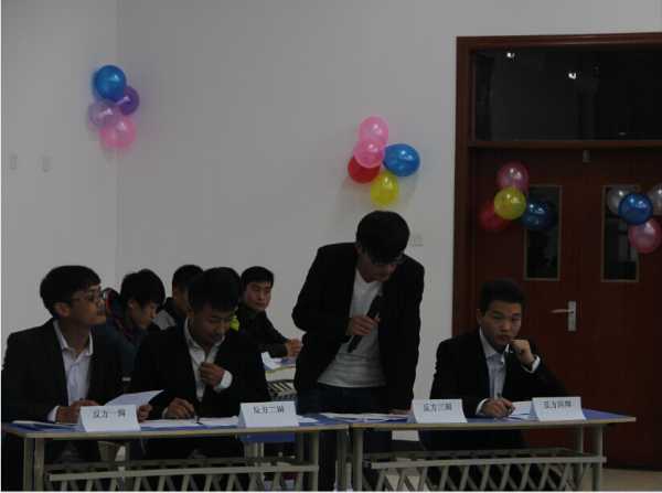 经过多场残酷的角逐,坚持到决赛的这四支队伍及由最佳辩手组成的两支队伍,一进入教室整个会场就开始弥漫浓烈的火药味,也预示着比赛的精彩。随着主持人宣布比赛开始,双方一辩各自阐明了自己的观点并旁征博引条理清晰的来力证自己的观点。开篇陈词后进入攻辩及自由辩论环节。每支队伍都气势逼人,力求在气势上压倒对方。双方辩手对对方辩友的猛烈攻击镇定自若,凭借快速的反应和有力的言辞化险为夷。时而慷慨激昂,时而咄咄逼人。辩手们的妙语连珠、能言善辩令人惊叹叫绝。现场的氛围也随着自由辩论顿时达到高潮。 赛过程中激情澎湃、争锋相对。各组的辩手们配合默契,他们的妙语连珠、当仁不让,辩论场上的思维碰撞、灵光闪现都给在场的评委和观众留下深刻的印象。 最后学生分会主席白晓铭宣布了本场最佳辩手得主,并为辩论赛获胜者颁发荣誉证书。