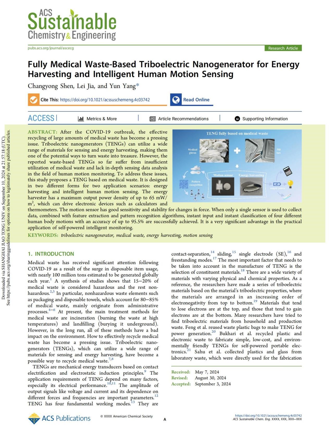 近日,必威西汉姆官网平台杨云博士科研团队与同济大学合作的科研成果《Fully Medical Waste-Based Triboelectric Nanogenerator for Energy Harvesting and Intelligent Human Motion Sensing》,发表于美国化学学会权威期刊ACS Sustainable Chem. Eng(中国科学院一区TOP)。该研究得到山西省基础研究计划项目(no. 202303021212285、202303021221176、202303021212284)、吕梁市引进高层次科技人才重点研发项目(no. 2022 rc09)等项目的支持。论文作者为同济大学申昌永、西汉姆联贾磊同学与杨云博士,杨云博士为唯一通讯作者,必威西汉姆官网平台为通讯单位。