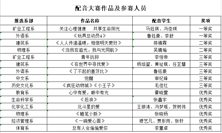 为了进一步丰富学生心理健康教育活动,大学生心理健康教育与咨询中心于2022年4月18日至5月18日开展了以“寻找爱,传递爱”为主题的“配音大赛”活动。我系学生积极参加,经过系部初审、咨询中心组织人员评审,机械设计制造及其自动化2102班马钰祺获得一等奖,煤层气2101班李恒帝获得三等奖的好成绩。