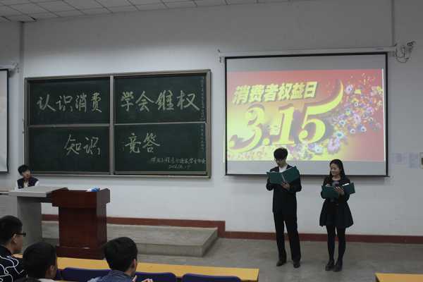 活动概况:于2016319日晚,在教学楼22-202介教举办了有关3.15知识竞答活动。本次活动由矿业工程系分团委、学生分会自律委与矿业工程系分团委、学生分会外联部共同举办。出席人员有矿业工程系分团委、学生分会副主席纪开明,矿业工程系分团委、学生分会自律委部长刘宇杰,宣传部部长吴树宝,外联部部长刘智慧及矿业工程系2015级各班班委及学生会成员。   本次活动以3.15消费维权日为契机,向同学们讲述一些关于3.15维权的方法及知识。活动分为三个环节,第一个环节为3.15知识普及,由纪开明学长通过ppt及短视频的形式来讲述3.15的起源和相关法律;第二个环节为知识竞答,让同学们在答题的过程中更深刻的了解到3.15的相关知识;第三个环节为家乡维权说,通过不同的地域不同的案例,来讲述各地不同的风土人情。