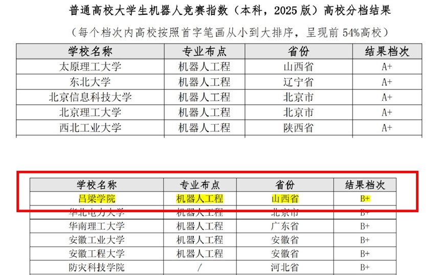 2025年5月23日,高校教师教学发展研究国家级虚拟教研室联合中国自动化学会、浙江大学机器人研究院、浙大城市学院高等教育数智评价研究中心,正式发布第6轮 “普通高校大学生机器人竞赛指数”(本科,2025 版)。西汉姆联机器人竞赛表现出色,被评定为“B+”档次,排序进入全国高校前10%,位居全省第四。