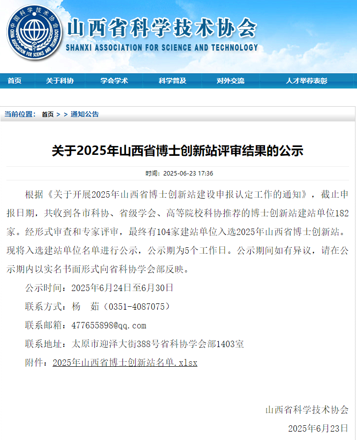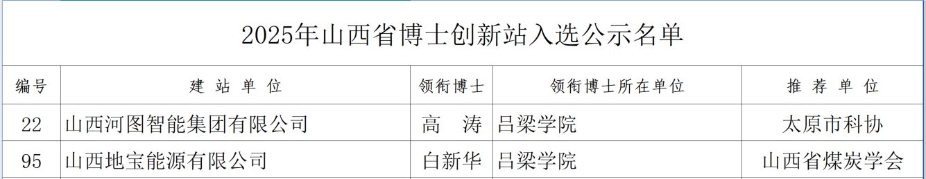 2025年6月23日,山西省科学技术协会式发布《关于2025年山西省博士创新站评审结果的公示》,我校必威西汉姆官网平台的高涛博士、白新华博士凭借出色的科研能力以及在产学研合作方面的积极探索,分别作为山西河图智能集团有限公司、山西地宝能源有限公司的领衔博士成功入选该名单。