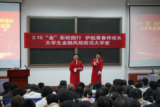 讲座中,工商银行客服经理曹转转以《青春无诈,理性消费》为题,深入讲解了3.15权益日的由来与意义,重点剖析了“校园贷”的常见陷阱及维权途径;民生银行个金部经理孟艳娜围绕《普及金融知识——有效识别电信网络诈骗》,通过剖析当前电信网络诈骗的严峻形势,传授了实用的防骗技巧;山西证券投教中心讲师李真宇聚焦防范非法证券期货基金活动,结合“场外配资”“非法荐股”等典型案例,揭示了股市“黑嘴”的危害。太平洋财险吕梁中支特邀山西省青年相声演员刘乾、孙永刚,将枯燥的防诈知识编成朗朗上口的快板——《金融防诈我宣传,全员合力防风险》,精彩的表演赢得了阵阵掌声,也让金融安全知识更加入脑入心。